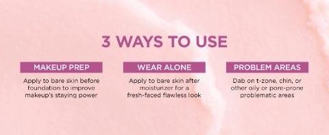- BASE DE MAQUILLAJE PARA ROSTRO Y OJERAS: Aplíquela en la piel limpia, o después de que la crema hidratante se haya absorbido por completo. Aplíquela en las ojeras para suavizar las líneas de expresión, en nariz y mejillas para minimizar la apariencia de poros y manchas, y en la zona t para obtener un resultado mate