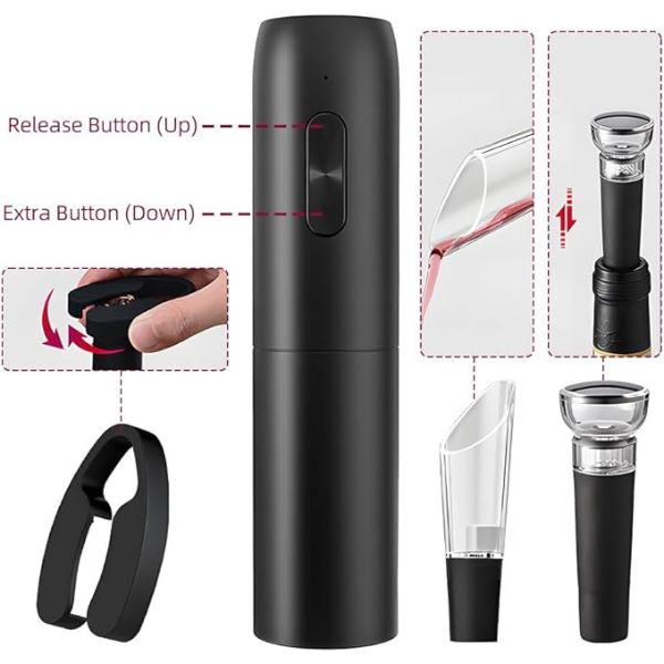 Disfruta de abrir vino sin esfuerzo con este set de abridor de vino eléctrico, que cuenta con un potente dispositivo que extrae suavemente los corchos de las botellas. Di adiós a los problemas con los sacacorchos tradicionales y al riesgo de que se rompan los corchos. Abre vino sin complicaciones.