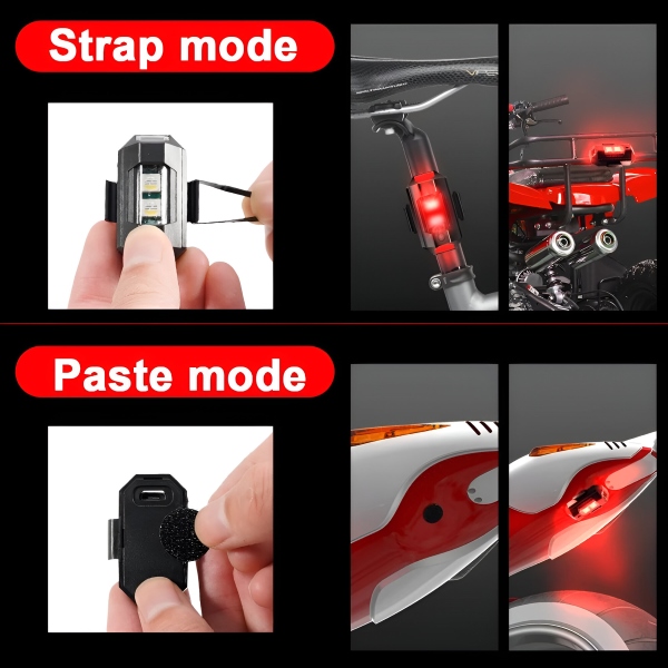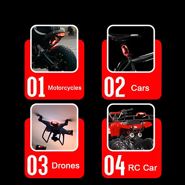 Estas luces son increíblemente versátiles y están diseñadas para adaptarse a coches, motocicletas, bicicletas y drones. Elige entre los métodos de instalación de velcro y anillo de goma para una configuración segura y sencilla. No hay necesidad de herramientas complicadas o ayuda profesional.