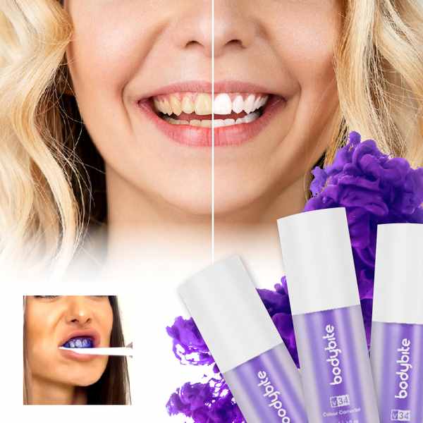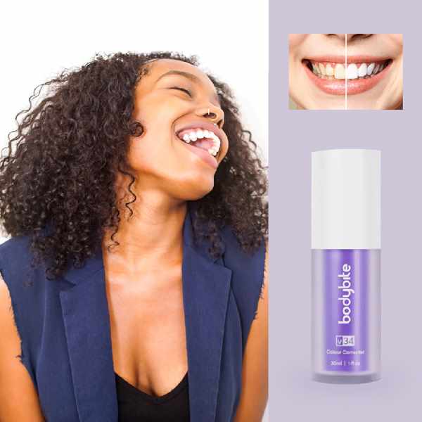 V34 utiliza tecnología de corrección de color para mejorar visiblemente el brillo de tu sonrisa. Dado que el morado es el color complementario del amarillo, la fórmula ayuda a equilibrar los tonos amarillos no deseados para una apariencia más uniforme y radiante. El resultado es una sonrisa de aspecto instantáneamente más fresco — sin tratamientos agresivos ni pasos complicados.